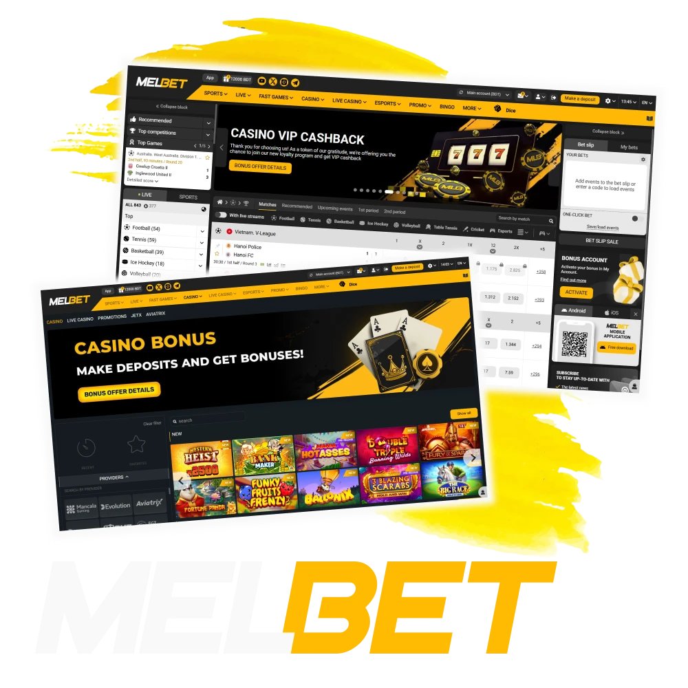Melbet হল স্পোর্টস বেটিং এবং ক্যাসিনো গেমগুলির জন্য একটি প্ল্যাটফর্ম যা 2012 সালে তৈরি করা হয়েছিল৷ আমাদের ওয়েবসাইটে, আপনি হাজার হাজার গেমের পাশাপাশি প্রতিদিন 200+ খেলাধুলার ইভেন্ট পাবেন৷ ওয়েবসাইটটি ছাড়াও, আপনি মোবাইল অ্যাপটি ইনস্টল করতে পারেন এবং চলতে চলতে খেলতে পারেন। আমাদের সাথে যোগ দিন এবং ক্যাসিনো বিভাগে স্পোর্টসের জন্য 12,000 টাকা এবং গেমের জন্য 315,000 টাকা + 250 এফএস স্বাগত বোনাস পান।