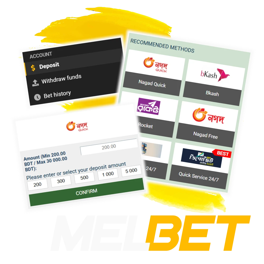 You can start playing at Melbet with as little as 60 BDT. This amount applies to payments made through WebMoney. Other methods may require more. For example, most UPI and mobile wallet options start from 431.22 BDT, while crypto deposits usually begin at 500.00 BDT. Skrill requires at least 735.47 BDT. Before choosing a method, always check the current limits on the deposit page. The minimum and maximum deposit amounts depend on the system you select, but all methods allow fast and secure payments in BDT.